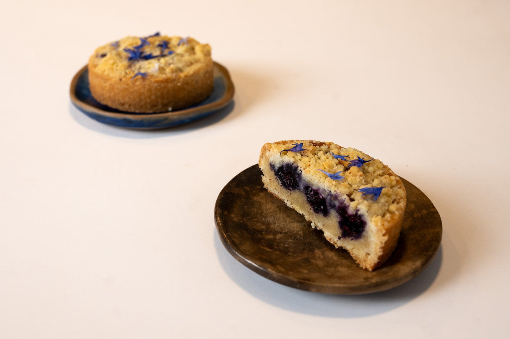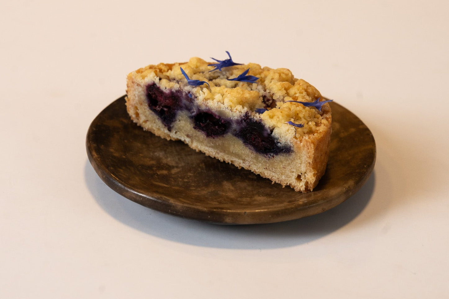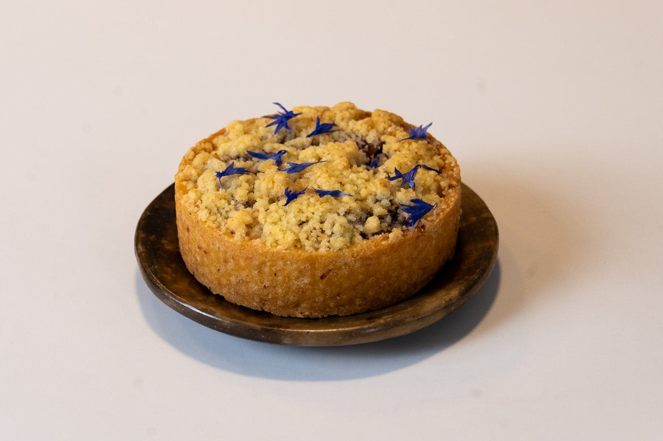 Sablée de almendras, crema de almendras, arándanos y crumble de almendras.