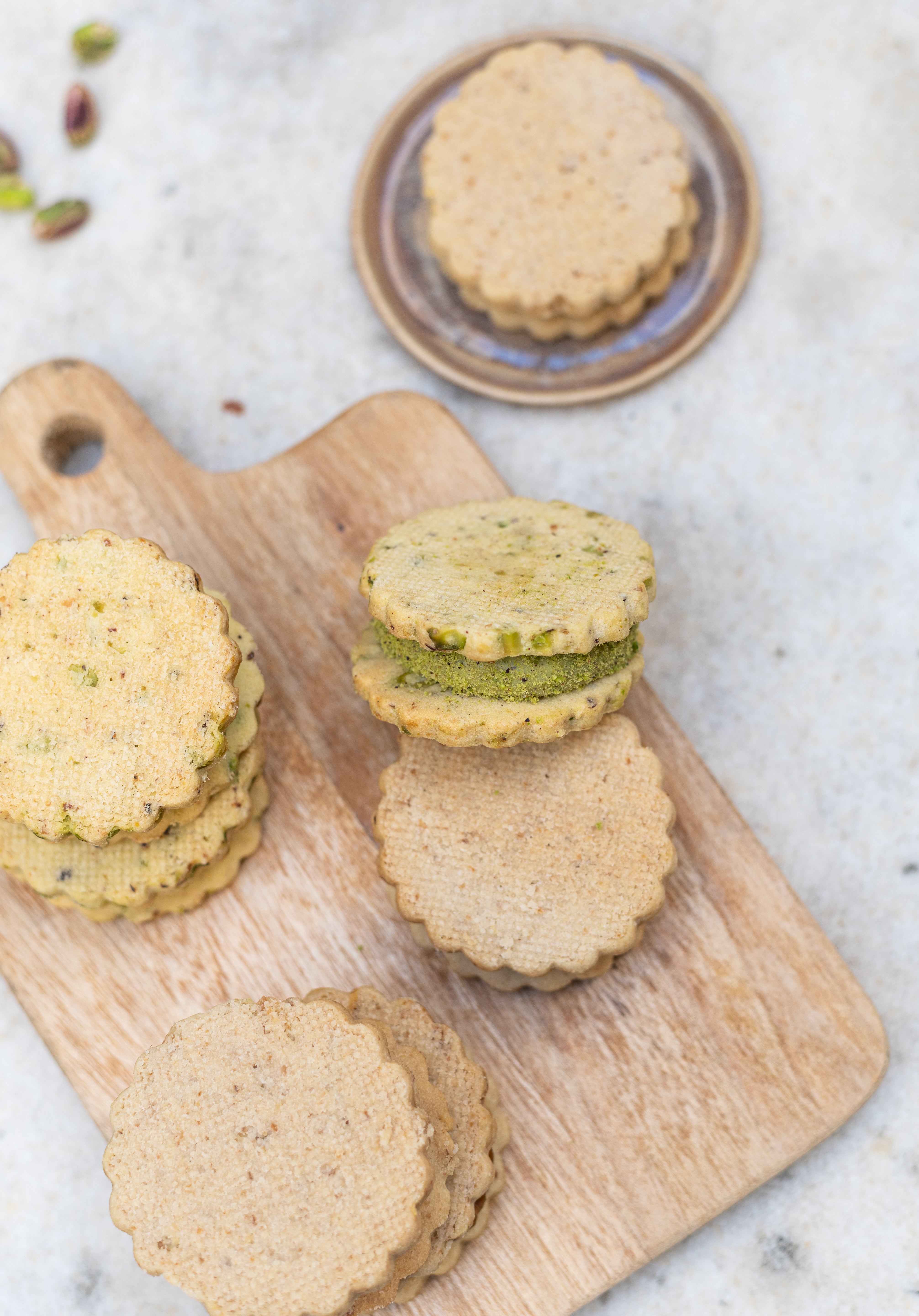 Sablée de pistacho, ganache de pistacho y centro de confitura de frambuesa.